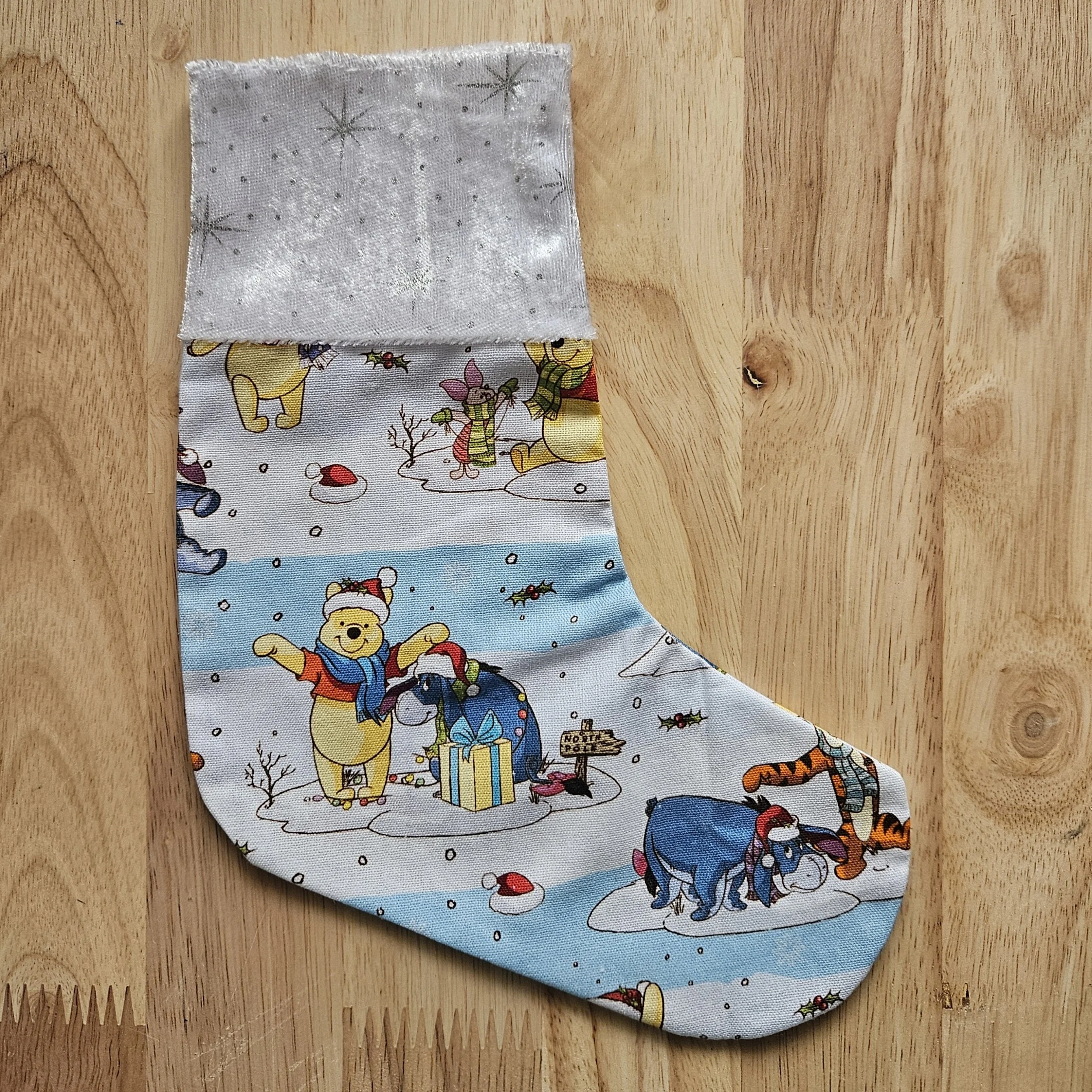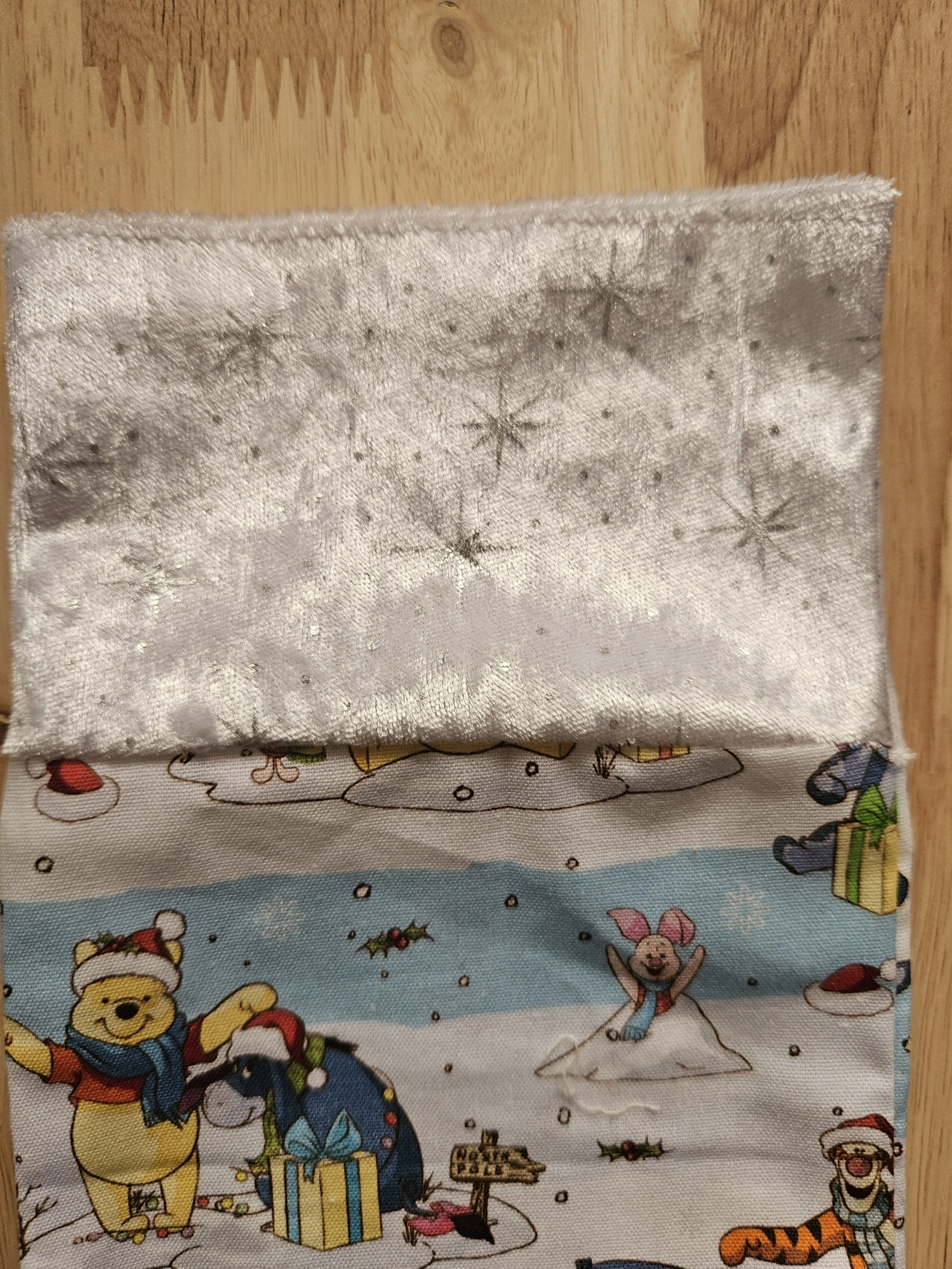 Decorated with scenes of Pooh and friends playing in the snow and a white velvet top with silver stars and snowflakes